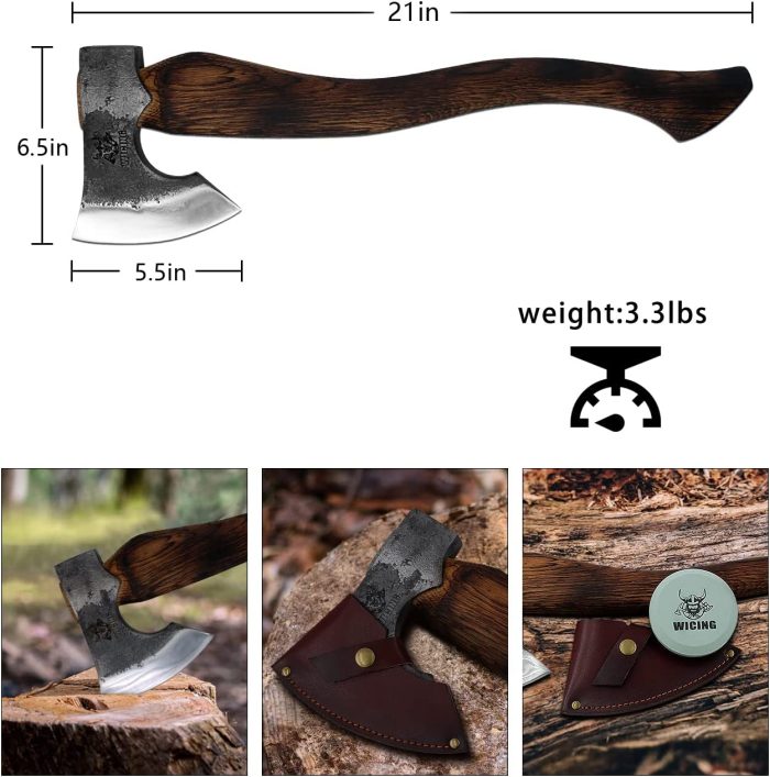 - Dimensions: Head Weight: 1.5 lbs, Length: 21 inches, Total Weight: 3.3 lbs. (Set includes: 1 ✗ axe, 1 ✗ leather Sheath, 1 ✗ sharpening, 1 ✗ spare steel wedge)