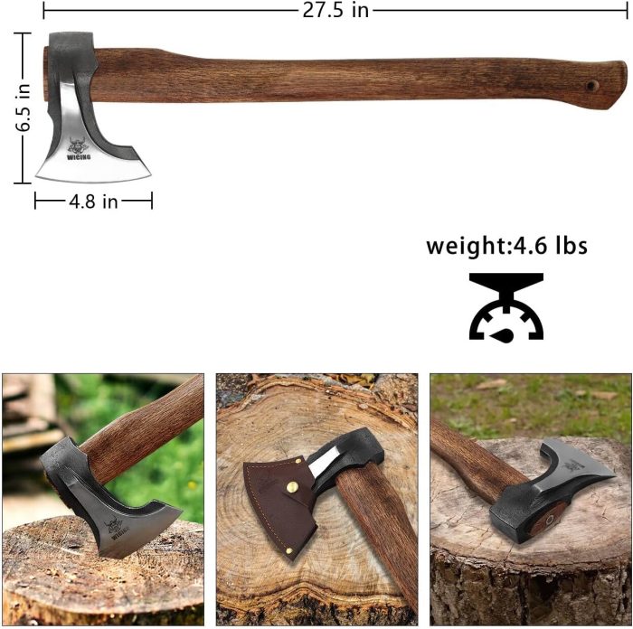 WICING Splitting Axe, 27.5-inch Chopping Axe with Leather Sheath, Camping Hatchet 1065 High Manganese Steel and Hickory Handle