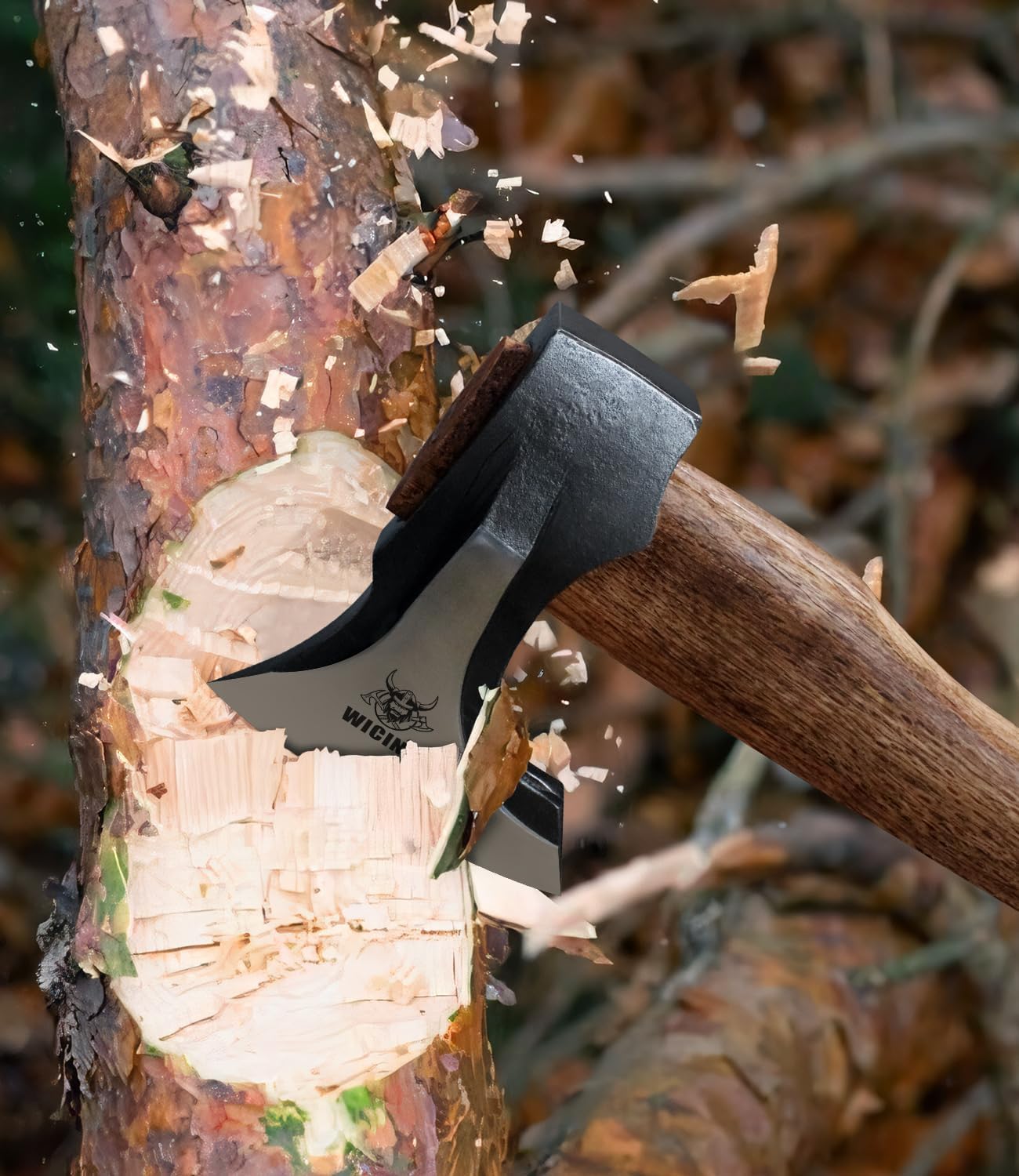 WICING Camping Hatchet – 15.2 inches Chopping Axe for Wood Splitting and Kindling, 1065 High Manganese Steel and Beech Wooden Handle, with Leather Sheath
